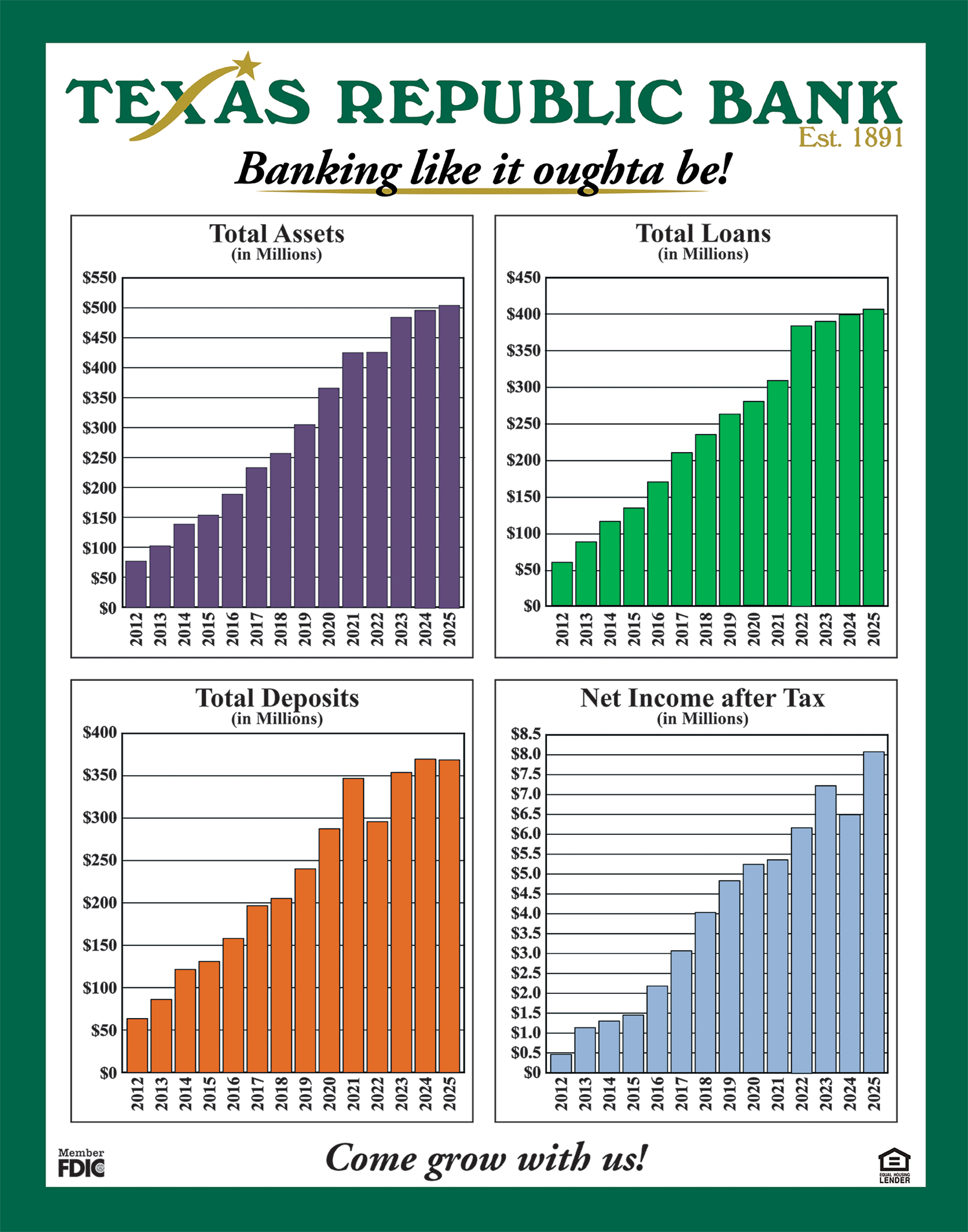 Today, our bank maintains one of the strongest capital ratios in the state of Texas and is supported by an experienced and highly qualified Board of Directors and Management Team. For our customers, this means confidence in our financial strength, long-term stability, and the assurance that decisions are made locally by bankers with the authority and experience to serve you effectively. We live, work, serve, and invest where our customers do, guided by the principles of Common Sense and the Golden Rule.